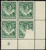 1938-51 ½d green lower right corner Plate 2 block of four showing a large unprinted area on the corner stamp; the result of an intrusion, not a fold. Unmounted o.g., fine save for a couple of (printing) ink marks on the reverse, seemingly partial fingerprints. A quite spectacular block. SG 25 var