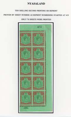 1938 10/- bluish green and brown-red on ordinary paper, two right columns of sheet with Plate and sheet numbers. Hinged on the selvedge only, the stamps unmounted but unfortunately with some foxed spots on reverse; nevertheless a significant multiple with very few blocks recorded, of which this must be among the largest. Excellent appearance. Ex Springbett. SG 142a, £4250