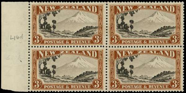 1936-42 Pictorial 3/- Multiple watermark inverted, perf 13-14 x 13½, a fine unmounted marginal block of four. SG 590aw, £800