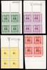 Postal Fiscals. !940 Single watermark surcharged set of four in corner blocks of four, top right corners with sheet numbers save the 22/-, which is lower right. Lightly hinged; the 3/6d fine, the 5/6d with foxing on the reverse, the 11/- with some light toning adversely affecting one stamp only, the 22/- (BPA Certificate, 2007) fine save the upper pair with some barely noticeable foxed perf tips, with the lower pair fine unmounted. SG F187-190, £4400