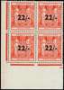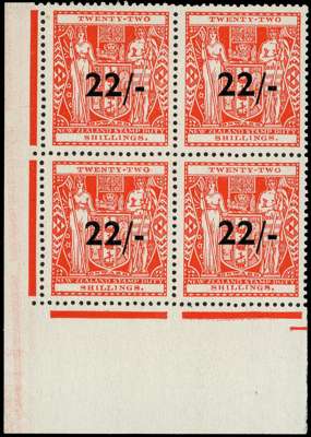 Postal Fiscals. 1945 22/- on 22/- Multiple watermark upright, lower left corner block of four, unmounted o.g. with cream gum, fine. SG F216, £1800
