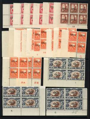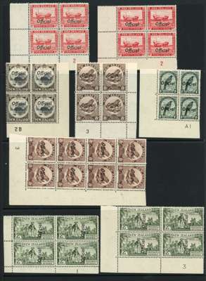 Officials. 1936-44 Pictorial Multiple watermark Plate blocks, o.g. with just one hinged stamp noted. 1d A1 (2), A2, B2, B3; 1½d 1B (block of six); 2d 14 x 13½ 1B, 2A (2), 2B (2), 3A, 3B, 4A, 4B and 5; 2d perf 14 2A, 2B; 2½d perf 13-14 x 13½ (one stamp hinged), perf 14 (2); 4d perf 14 x 14½; 6d perf 12½ and 14½ x 14; 8d perf 12½, perf 14 x 14½ block of 8 with ‘broken 8’ flaw; 1/- perf 14 x 13½; 2/- perf 12½, and 14 x 13½ Plate 3. Fine group. SG O121-O132d