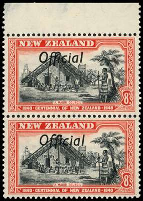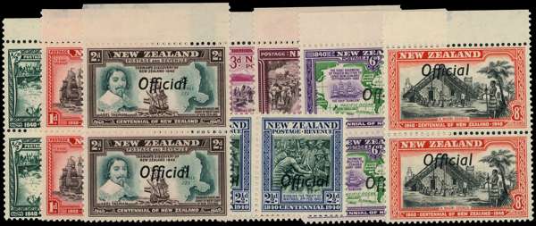 Officials. 1940 Centennial ½d to 8d set in vertical marginal pairs with R1/10 joined ‘ff’ (2½d left marginal strip with the variety from R8/3), the stamps fine unmounted, the margins mostly with thins. SG O141, a-9a, £697