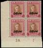 Officials. 1951 1/- red-brown and carmine Plate 3A-2 block of four with inverted watermark, unmounted o.g. A rare Plate block. SG O157bw, £900+