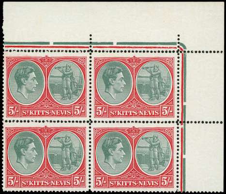 1943 5/- ordinary paper top right corner block of four with R2/4 break in frame above ornament, unmounted o.g. SG 77, bb, £440