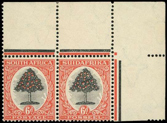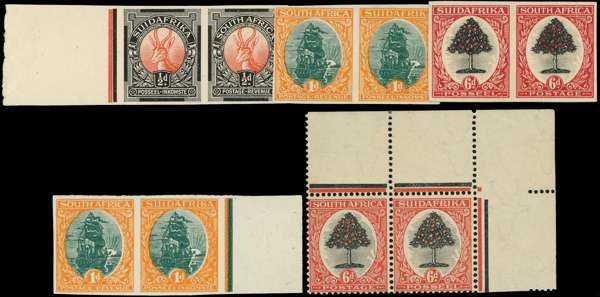 1926-7 Pretoria imperforate colour trials group, ungummed. ½d red and black on thick paper, marginal; 1d green and orange on wove paper (2), and 6d grey-black and orange-red on thin card (right impression with unobtrusive crease). Also perforated 6d in grey-black and orange-red top right corner example, gummed, the stamp impressions unmounted. Ex Alec Page. For SG 30-2