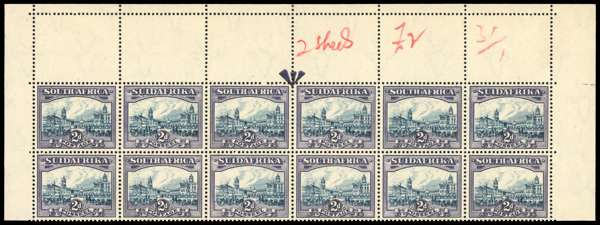 1938 2d blue and violet top two rows of the sheet (six pairs) with Issue 3 arrow, hinged on the selvedge only with the stamps unmounted. Red crayon notation on top selvedge, otherwise fine, minor varieties per Handbook. A rare multiple. SG 44e, £2400