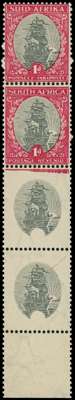 1933-48 hyphenated 1d grey and carmine with watermark inverted, vertical strip of four from the base of the sheet, the bottom stamp with frame completely omitted apart from a curved line, and the stamp above with a mere trace left at the top. Unmounted o.g. SG 56b