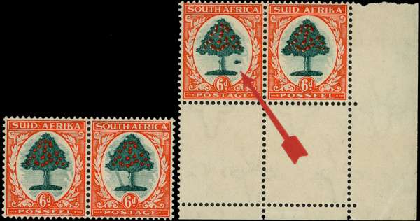 1937 hyphenated 6d Die I two o.g. pairs, one with R5/10 ‘falling ladder’, a couple of hingemarks otherwise fine; and corner pair, R20/11 ‘molehill’, fine appearance (arricator on selvedge) but gum severely two-toned. SG 61a, b, £550