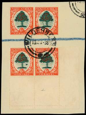 1933-48 hyphenated 6d Die I, two horizontal pairs used on piece, the upper pair with R4/10 ‘falling ladder’; the lower pair from the bottom right corner, R20/11 ‘molehill’, Wilderness CDSs of 13.1.38. Scarce this fine. SG 61a, b, £625