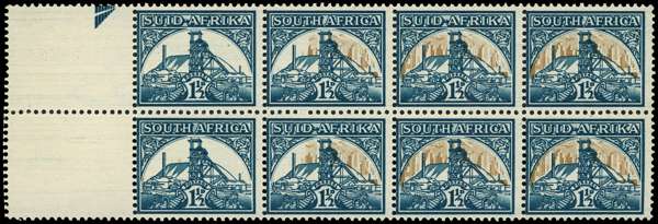 1941 medium format 1½d blue-green and yellow-buff unmounted o.g. part arrow block of four pairs, the two left stamps with complete omission of yellow-buff and the two adjacent stamps with partial omissions. A lovely piece. SG 87ab, £6000