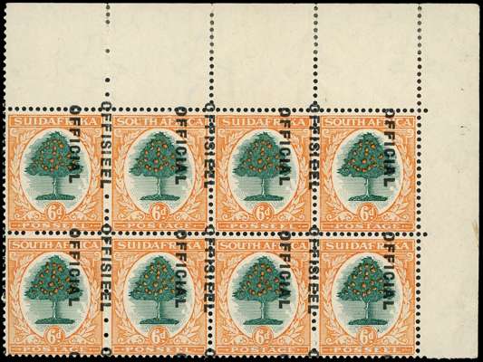 Officials. 1930-47 unhyphenated 6d green and orange, watermark inverted, top right corner block of four pairs. Overprint with a good shift upwards and to left; o.g., hinged on the selvedge, which is lightly reinforced in places. SG O16 var