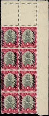 Officials. 1935-49 hyphenated 1d grey and carmine top right corner block of four pairs showing overprint double, unmounted o.g. Slight splitting in top selvedge only, one small toned spot and the gum has some light two-toned stripes, not detracting from the excellent appearance. Unlisted in the Handbook and Part 1, undoubtedly a very rare multiple. SG O21 var