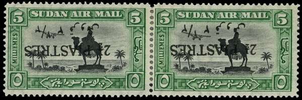 1935 2½p on 5m black and green horizontal pair with surcharge inverted, the right stamp showing small ‘½’. Perforations between the stamps sensibly reinforced. Very rare. especially in a multiple. Ex William Frazer. SG 70c, e, £5500