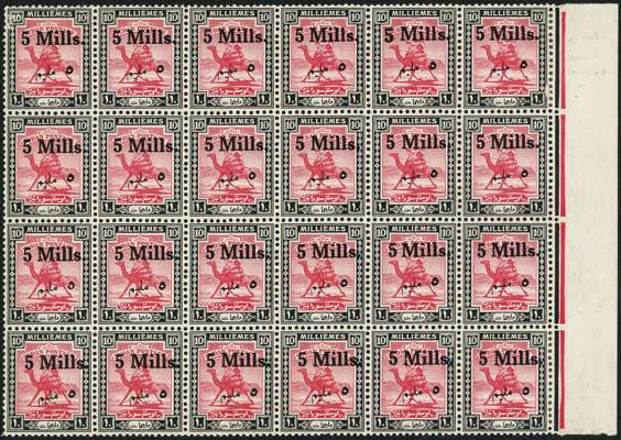 1940 5m on 10m block of twenty-four with selvedge at right, the fifth stamp with R6/2 (lower right pane) inserted ‘5’, and the fourteenth stamp with R6/2 RP broken ‘lam’. O.g., hinged on two normals only with selvedge reinforcement affecting one further stamp. RPS Certificate (1971). SG 78, d, e, £341