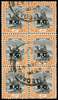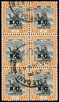 Officials. 1946 1m black and orange block of six with double overprint, used with Wadi Medani CDSs of 25 JAN 47. RPS (1981) and Charles Hass (2006) Certificates. SG O32a, £1500