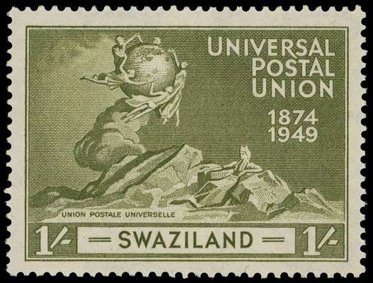 1949 UPU 1/- olive unmounted o.g., showing ‘A’ of CA in watermark omitted. Rare. SG 51a, £1000