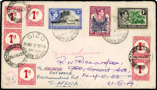 Postage Dues. 1946 incoming envelope from Gizo, Solomon Islands to USA, franked at 1/9d with 26 MAR CDSs. Readdressed to Palapye and then redirected to Francistown, where it was marked ‘T6d’ and six 1d Postage Dues were affixed. An unusual and rare franking, ex Inglefield-Watson