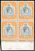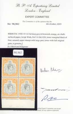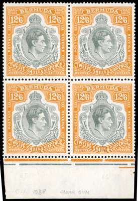1938 12/6d deep grey and brownish orange lower marginal block of four (#s 41-54), large part o.g. (upper pair) or unmounted (lower pair). Really fresh and fine with excellent gum for this stamp. Ex Ulrich (with his pencil annotations on the reverse of the selvedge) and Dickgiesser, a rare multiple. SG 120, £2500
