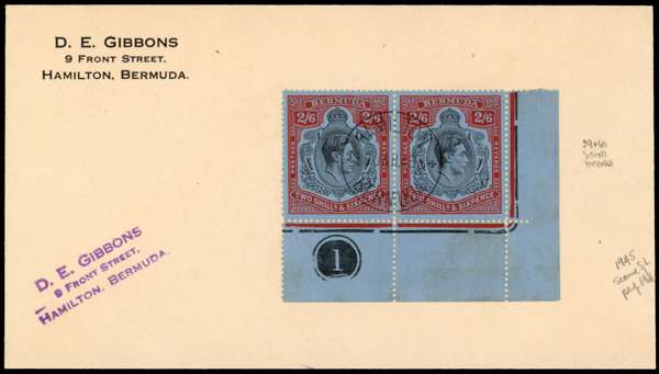 1946 D.E. Gibbons envelope with lower right corner Plate number pair of the 2/6d line perf, HPFs #59 broken top right scroll and #60 broken lower right scroll. Beautifully struck by Hamilton 30 JAN 46 CDS. SG 117ad, ae, £2200