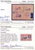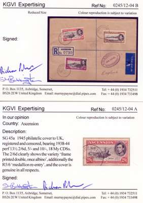 1945 philatelic cover to UK, registered and censored, bearing perf 13½ 2/6d, 5/- and 10/- with 18 MY CDSs. The 2/6d clearly shows the frame printed double, once albino. As a bonus, it also has the R5/6 medallion re-entry. Very rare, KG VI Expertising Certificate (2004). SG 45a, £5000