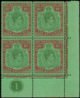 1941 (Sept) 10/- line perf Plate block of four, HPFs #59 broken top right scroll and 60 broken lower right scroll. O.g. with naturally streaky gum, the lower pair with the varieties unmounted, the upper pair with hinge remainders; well centred, fine appearance. SG 119b, bd, be, £6000