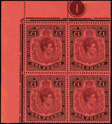1937 (Nov) £1 purple and black on red paper top left corner Plate block of four, FF #2 joined ‘ER’ (full state), also FFs #1A and 1B. The stamps unmounted o.g. but with some small black marks on reverse. A rare Plate multiple, ex Stuart Stokes. SG 121, a, £2000