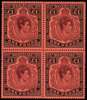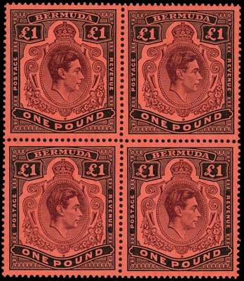 1943 (Mar) £1 deep reddish purple and black on pale red paper block of four, top left stamp with HPF #17 gash in chin (and FF #17 broken shading), unmounted o.g. SG 121c, cf, £2180