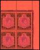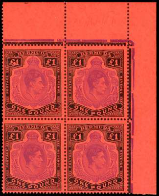 1951 (Nov.) £1 pale violet and black on bright red paper corner block of four with FF #11 damaged left value tablet, the ‘White Island’ flaw, unmounted o.g. Constant on part of the printing only; a rare multiple. SG 121d, da, £4665
