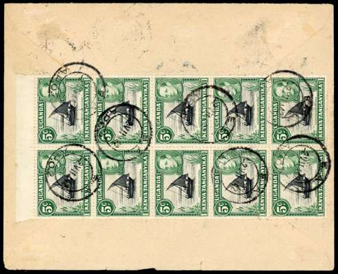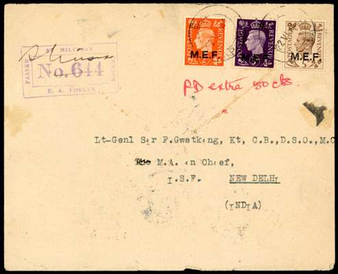 1942 envelope to India bearing Nairobi 2d and 3d round stops, plus Cairo 5d, tied by APO 55 (Ethiopia) CDSs of 22 vi. Shortfall of 50c, indicated in red manuscript on front, paid by block of ten KUT 5c on reverse, APO 2 CDSs. Violet censor 644 on front