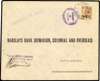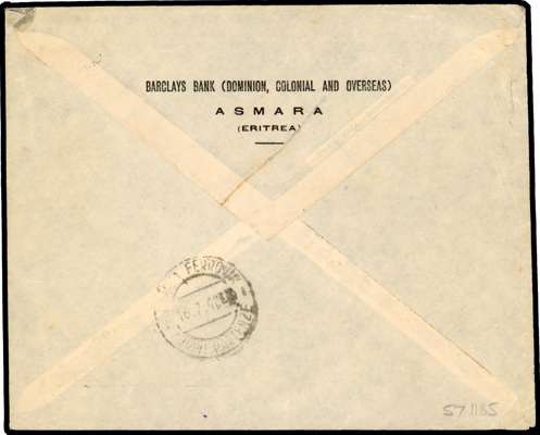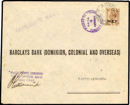 1942 Nairobi 5d round stops on commercial envelope (bank correspondence) to Kampala, tied by Asmara CDS of 16 7 42 with OETA 3 Censor alongside. ENCLOSURES CERTIFIED TO BE OFFICIAL BANK MAIL ONLY in violet on front. Minor faults but a nice commercial usage. SG M10a, £140 x 4