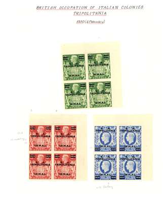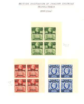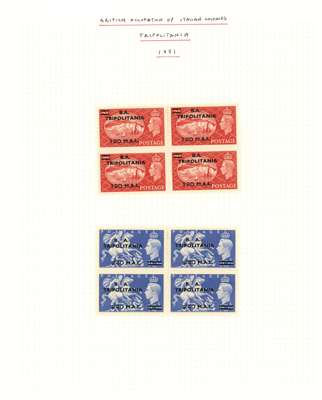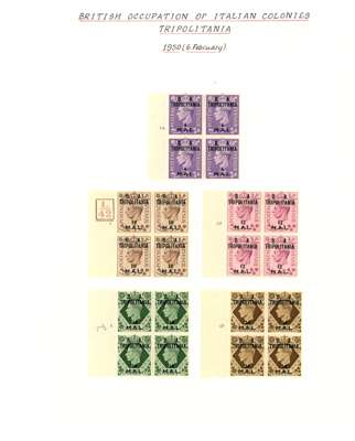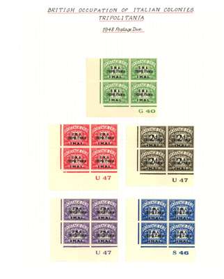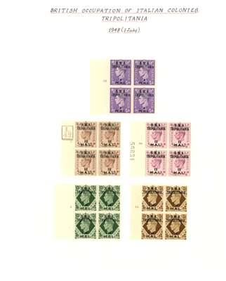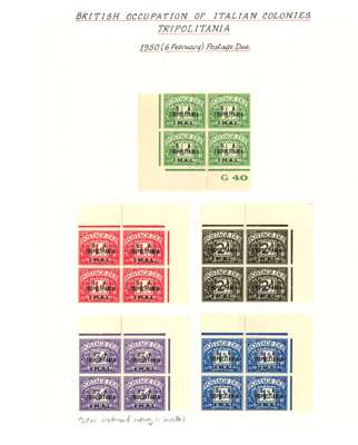 1948-50 issues in mint blocks of four on Godden leaves. BMA and 1950 BA high values in top right corner blocks with the upper pairs unmounted; BMA 60l R2/8 flaw on cheek, 120l R2/7 ‘T’ in hair; 1950 BA 120l R1/7-8 heavy re-entering at left, 240l R1/7 ‘blueberry’; 1951 high values plain blocks with the lower pairs unmounted but one 240l with foxed spot. BMA Dues in Cylinder blocks with lower pairs unmounted, BA Dues in corner blocks with lower pairs unmounted. T1-TD10, £1800
