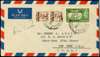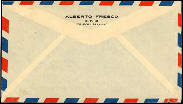 1951 airmail envelope to New York with 10l vertical pair and 60l Festival, Tripoli CDSs of 1.8.51. ‘A.V.2’ handstamp alongside. Envelope with minor wrinkles. SG T20, 32