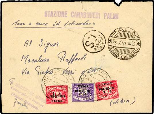 Postage Dues. 1950 envelope from STAZIONE CARABINIERI PALMA, sent unstamped, Palma 26.7.50 CDS, and circular A.R./ POSTE/ T.S. on front; on arrival at Tripoli, two B.A. 2l and one 6l applied and cancelled by 5.8.50 CDSs. Envelope with a few faults, but a rare cover. SG TD6, 9