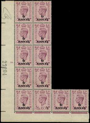 1948 6a on 6d purple irregular block of twelve with Cylinder 36 and sheet number, R20/2 showing almost complete omission of the surcharge. O.g., hinged on the top left stamps only, and a tiny reinforcement between the variety stamp and R20/3. A spectacular and unique multiple, referred to in the footnote below the set in Part 1, ex the Amir of Bahawalpur and Donaldson. BPA Certificate (1969), ‘showing only a very faint impression of the surcharge’. SG 22 var