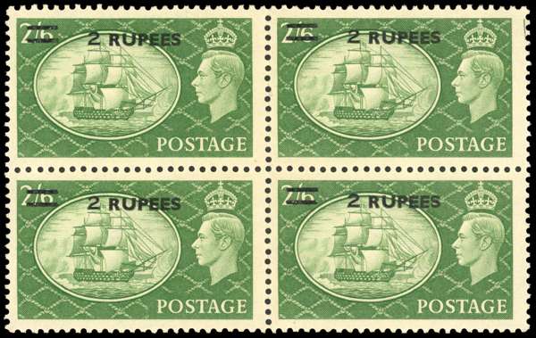 1955 2r on 2/6d yellow-green block of four, surcharge Type II, unmounted o.g. Gum two-toned, otherwise fine with excellent appearance, ex Donaldson. SG 41a, £1600