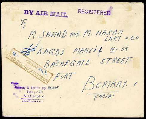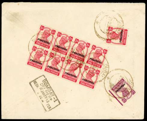 1947 registered cover with, on reverse, Pakistan 1a block of eight and single and ½a, tied by Dubai CDSs of 27 DEC. On front, boxed DUBAI/ PERSIAN GULF DISTRICT Type 9. Rare.