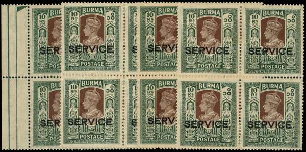 Officials. 1039 10r brown and myrtle twenty examples in blocks of four and six, unmounted o.g., the odd small blemish but mainly fine. SG O27, £2800