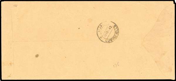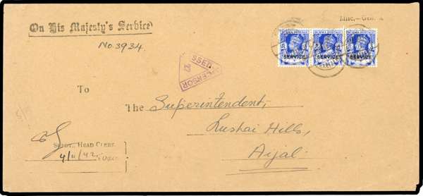 1942 OHMS envelope (10 x 4½") from Falam to Aijal with Official 6p strip of three, 5 NOV 42 CDSs. Violet triangular PASSED X CENSOR 27 alongside; AIJAL LUSHAI HILLS arrival of 13 NOV on reverse. Minor wrinkles, still fine. #23 of the 26 recorded by Davis