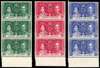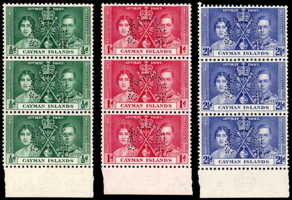 1937 Coronation set in bottom marginal vertical strips of three, perforated SPECIMEN Type B9, o.g. One ½d and 1d with hints of foxing; at least one in each strip unmounted. Scarce multiples. SG 112s-114s, £450