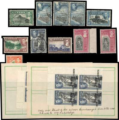 1938-48 varieties. Confetti flaws, used unless stated; 3c large part, affecting portrait and frame; 6c with two separate flaws, one on King's forehead and another partial affecting sea by the jetty (the first time we have seen two confetti flaws on the same stamp); 6c pair, left stamp with large part confetti flaw at upper left; 10c large part, affecting frame at right; 15c similar; 20c large part, affecting frame at left; 1r unused, no gum, large part, affecting portrait; 2r black and carmine two o.g. examples, one with full flaw affecting portrait and the other with a small part affecting much the same place. Also 5c, 10c and 15c with pre-printing paper creases, and two o.g. blocks of four of the 3c on 20c with faked surcharge varieties