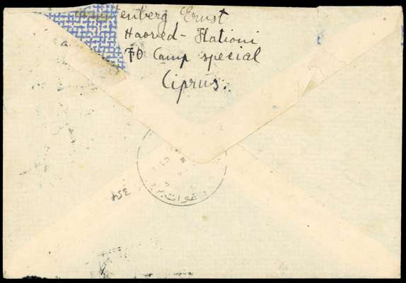 Postal History. 1948 envelope to Palestine bearing 1pi and 2pi, each cancelled with violet cachet HQ 3 CAMP/ DATE…../ STAFFS (SPECIAL) CYPRUS with date 24 JUL 1948 added by separate handstamp. This handstamp was applied at the camp (for illegal Jewish immigrants) before arrival at the local Post Office, where XYLOTYMBOU CDS (Proud D2) of 29 JY was used to cancel the 2pi only. Small part of backflap missing, minor creasing, arrival CDS on reverse. A fine and scarce cover