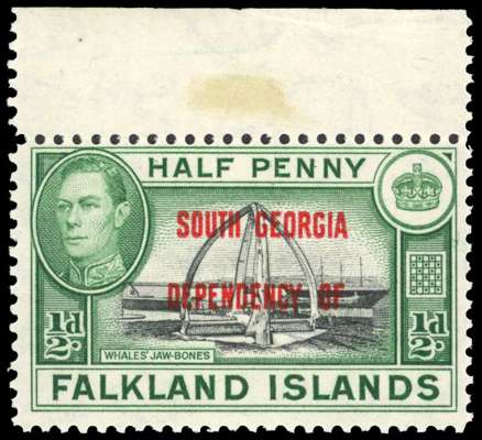 1944 South Georgia ½d top marginal example with watermark sideways, hinged on the front of the selvedge only, the stamp fine unmounted o.g. Scarce. SG B1a, £4750
