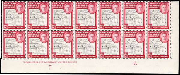1948 Thin Map 2d Plate 1A and imprint block of fourteen, showing Map double. Fine o.g., the stamps unmounted, one light hingemark in selvedge and the selvedge with minor corner crease. A remarkable multiple and a great Dependencies rarity. SG G11 var, Heijtz 46v1, £14000