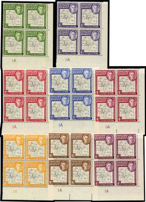 1948 Thin Map original set of eight (2½d does not exist in this form) in FP1A blocks of four, each with R5/10 dot on ‘T’. Hinged on selvedge only, the stamps unmounted o.g.; a few minor bends, mostly marginal. SG G9, b - 18, a, £587