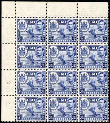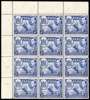 1938-55 3d blue corner block of twelve, R4/2 spur in medallion and 3/3 top right corner re-entry, o.g., hinged on the selvedge only. SG 257a, £750