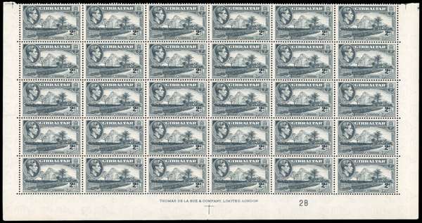 1938-51 2d grey perf 13, watermark sideways, lower half-sheet unmounted mint. R7/1 shows missing ‘A’ of CA. Fold, minor wrinkles, otherwise fine and rare. SG 124ba, £1700