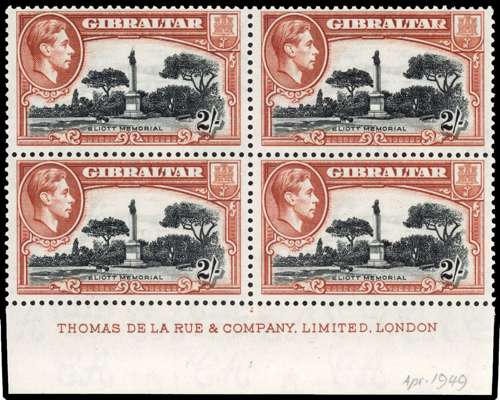 1942-51 2/- perf 13 imprint block of four, R9/3 ‘bird on memorial’ and 9/4 broken ‘R’, large part o.g. Fresh and very lightly hinged, ‘Apr. 49’ pencilled on selvedge. Rare. SG 128ba, bb, £3900