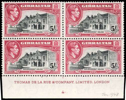 1944-51 5/- perf 13 imprint block of four with R9/4 broken ‘R’, lightly hinged large part o.g. ‘Jan 1948’ pencilled on selvedge; rare. SG 129ba, £5500