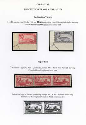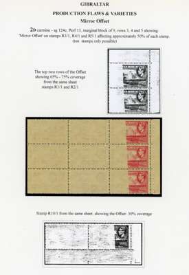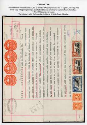 1938-51 printing varieties with 2d carmine unmounted o.g. block of nine, the three right stamps with a very fine offset covering half or more of the reverse, gum a little yellowed but still fine and rare; 2d carmine corner block of fifteen with varying degrees of dry print; 1½d both colours, each R10/1 with additional perforations in the selvedge due to paper folds; 2d carmine strip of three with pre-printing paper crease giving an unprinted area across two. Also three Madame Joseph postmark forgeries; #182 on 5/-, #183 on £1 and #187 on 10/-, and a range of Supreme Court fiscal usages, 24 stamps to £1 (2) and a fine indenture with 2/- (2), 10/- and £1 (2). Interesting group of considerable appeal to the specialist, ex Chambers